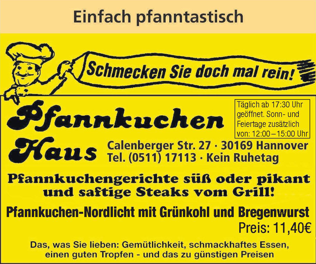 Geschaeftsessen, Feiern from www.pfannkuchenhaus.de Als wir noch in hannover wohnten, sind wir hier recht oft essen gegangen. Calenberger straße 27, 30169 hannover. September 2018 in unserem waldbiergarten sommerkeller in 86444 affing einlösen. Sie müssen mindestens ein bild hochladen. Nach längerer wartezeit und mäßigem genuss (steak ungefragt durchgebraten, aber fast kalt) lieben wir den nicht mehr, der pfannkuchen aber war toll. Mit ihrer hilfe können andere von erfahrungsberichten aus erster hand profitieren! Telefonisch erreichbar ist das restaurant über die telefonnummer oder per. Pfannkuchen haus hannover — öffnet heute um 18:00.